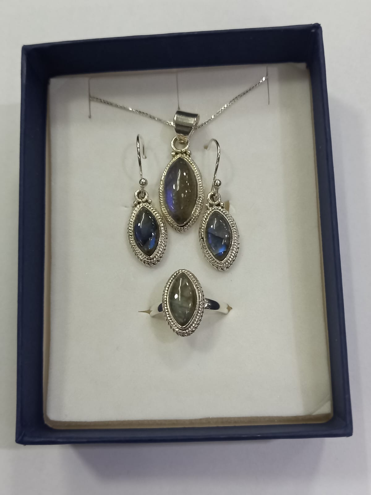 El Conjunto Vintage Labradorita Plata 925 se presenta en una caja rectangular azul oscuro con interior aterciopelado color crema. Este empaque no solo resguarda las piezas, sino que refuerza su carácter exclusivo, ideal para obsequios o colecciones personales de alta gama.